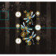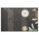 Antique dials and keys with gold and brass gears, decorated with mechanical, steampunk dragonflies on brown, striped background.