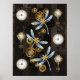 Antique dials and keys with gold and brass gears, decorated with mechanical, steampunk dragonflies on brown, striped background.