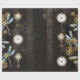 Antique dials and keys with gold and brass gears, decorated with mechanical, steampunk dragonflies on brown, striped background.
