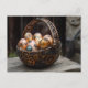 The background features a softly aged parchment texture, enhancing the antique aesthetic, while subtle wisps of steam rise from the basket, adding to the mechanical fantasy. Perfect for fans of steampunk and those who love a creative take on holiday traditions, this postcard is a standout way to send Easter greetings with a touch of mechanical magic.