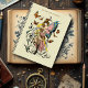 A blonde steampunk fairy with pink and blue wings. The fairy is wearing a cute outfit with a topcoat, corset and striped stockings. Butterflies, clock, gears and tribal design all in a backdrop of light yellow