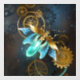 Steampunk firefly with blue transparent wings and green light bulb on worn, brown, textured background. Steampunk style.