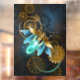 Steampunk firefly with blue transparent wings and green light bulb on worn, brown, textured background. Steampunk style.