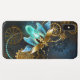 Steampunk firefly with blue transparent wings and green light bulb on worn, brown, textured background. Steampunk style.
