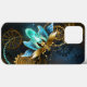 Steampunk firefly with blue transparent wings and green light bulb on worn, brown, textured background. Steampunk style.