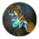 Steampunk firefly with blue transparent wings and green light bulb on worn, brown, textured background. Steampunk style.