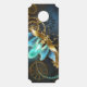 Steampunk firefly with blue transparent wings and green light bulb on worn, brown, textured background. Steampunk style.