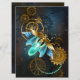 Steampunk firefly with blue transparent wings and green light bulb on worn, brown, textured background. Steampunk style.