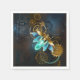 Steampunk firefly with blue transparent wings and green light bulb on worn, brown, textured background. Steampunk style.