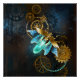 Steampunk firefly with blue transparent wings and green light bulb on worn, brown, textured background. Steampunk style.