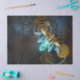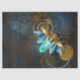 Steampunk firefly with blue transparent wings and green light bulb on worn, brown, textured background. Steampunk style.