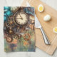 This pretty kitchen towel features AI-generated Steampunk style flowers and timepieces in centre on a yellow wildflower background.