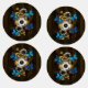 Composition of round steampunk clock with black Roman numeral dial, decorated with gold and brass gears, blue Morpho butterflies and damaged lenses on brown striped background. Steampunk style.