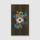 Composition of round steampunk clock with black Roman numeral dial, decorated with gold and brass gears, blue Morpho butterflies and damaged lenses on brown striped background. Steampunk style.