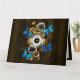 Composition of round steampunk clock with black Roman numeral dial, decorated with gold and brass gears, blue Morpho butterflies and damaged lenses on brown striped background. Steampunk style.
