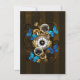 Composition of round steampunk clock with black Roman numeral dial, decorated with gold and brass gears, blue Morpho butterflies and damaged lenses on brown striped background. Steampunk style.