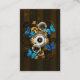 Composition of round steampunk clock with black Roman numeral dial, decorated with gold and brass gears, blue Morpho butterflies and damaged lenses on brown striped background. Steampunk style.