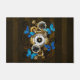Composition of round steampunk clock with black Roman numeral dial, decorated with gold and brass gears, blue Morpho butterflies and damaged lenses on brown striped background. Steampunk style.