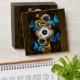Composition of round steampunk clock with black Roman numeral dial, decorated with gold and brass gears, blue Morpho butterflies and damaged lenses on brown striped background. Steampunk style.