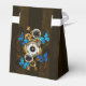 Composition of round steampunk clock with black Roman numeral dial, decorated with gold and brass gears, blue Morpho butterflies and damaged lenses on brown striped background. Steampunk style.
