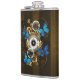 Composition of round steampunk clock with black Roman numeral dial, decorated with gold and brass gears, blue Morpho butterflies and damaged lenses on brown striped background. Steampunk style.