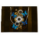 Composition of round steampunk clock with black Roman numeral dial, decorated with gold and brass gears, blue Morpho butterflies and damaged lenses on brown striped background. Steampunk style.