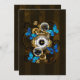 Composition of round steampunk clock with black Roman numeral dial, decorated with gold and brass gears, blue Morpho butterflies and damaged lenses on brown striped background. Steampunk style.