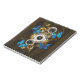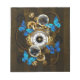 Composition of round steampunk clock with black Roman numeral dial, decorated with gold and brass gears, blue Morpho butterflies and damaged lenses on brown striped background. Steampunk style.