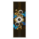 Composition of round steampunk clock with black Roman numeral dial, decorated with gold and brass gears, blue Morpho butterflies and damaged lenses on brown striped background. Steampunk style.
