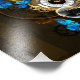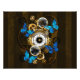 Composition of round steampunk clock with black Roman numeral dial, decorated with gold and brass gears, blue Morpho butterflies and damaged lenses on brown striped background. Steampunk style.