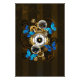 Composition of round steampunk clock with black Roman numeral dial, decorated with gold and brass gears, blue Morpho butterflies and damaged lenses on brown striped background. Steampunk style.