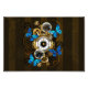 Composition of round steampunk clock with black Roman numeral dial, decorated with gold and brass gears, blue Morpho butterflies and damaged lenses on brown striped background. Steampunk style.