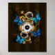 Composition of round steampunk clock with black Roman numeral dial, decorated with gold and brass gears, blue Morpho butterflies and damaged lenses on brown striped background. Steampunk style.