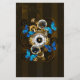 Composition of round steampunk clock with black Roman numeral dial, decorated with gold and brass gears, blue Morpho butterflies and damaged lenses on brown striped background. Steampunk style.