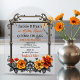 Unique wedding invitations with a silver and copper metal steampunk theme. Rustic metal gears and orange Autumn coloured flowers with a siler metal border on this transparent arch shaped acrylic wedding invitation.