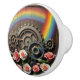 A knob for dresser drawers or kitchen cabinets or craft projects with gold and copper gears, pink roses and a rainbow background.