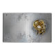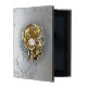Conceptual, mechanical, human head with antique manometer and metal gears against grey industrial background. Steampunk style.