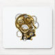 Conceptual, mechanical, human head with antique manometer and metal gears against gray industrial background. Steampunk style.