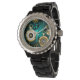 Jewellery, gold watch with a gold chain and keys on a green textural background. Steampunk style.