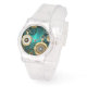 Jewellery, gold watch with a gold chain and keys on a green textural background. Steampunk style.
