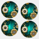 Jewellery, gold watch with a gold chain and keys on a green textural background. Steampunk style.