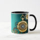Jewellery, gold watch with a gold chain and keys on a green textural background. Steampunk style.