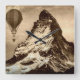 A Steampunk style hot air balloon floats across the Matterhorn mountain. Digital art in sepia
