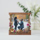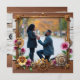 Romantic wedding Save the Date cards. Steampunk themed gold metal gears, pink and gold flowers and a weathered rustic white distressed wood background. Upload your favourite picture in the personalise area and edit the text on the back to add your own wedding info.