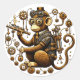 A steampunk-inspired monkey dressed in intricate mechanical attire. The monkey wears goggles, a vest, and a small top hat, while holding a complex mechanical device resembling a ray gun. Surrounding it are gears, pipes, and other industrial elements, creating a rich and detailed steampunk aesthetic. The golden tones of the mechanical parts contrast with the natural fur, blending organic and mechanical themes.