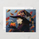 Cute brunette witch all dressed up in orange, purple and black. Two friends with her... a little mouse and a baby pumpkin getting a better close-up look at her. Autumn leaves falling all around them.
