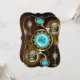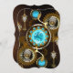 Turquoise lenses with an antique watch with brass gears and golden keys on rusty, brown background. Steampunk style.
