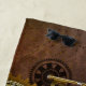 Turquoise lenses with an antique watch with brass gears and golden keys on rusty, brown background. Steampunk style.