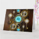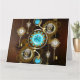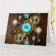 Turquoise lenses with an antique watch with brass gears and golden keys on rusty, brown background. Steampunk style.