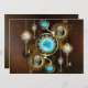 Turquoise lenses with an antique watch with brass gears and golden keys on rusty, brown background. Steampunk style.
